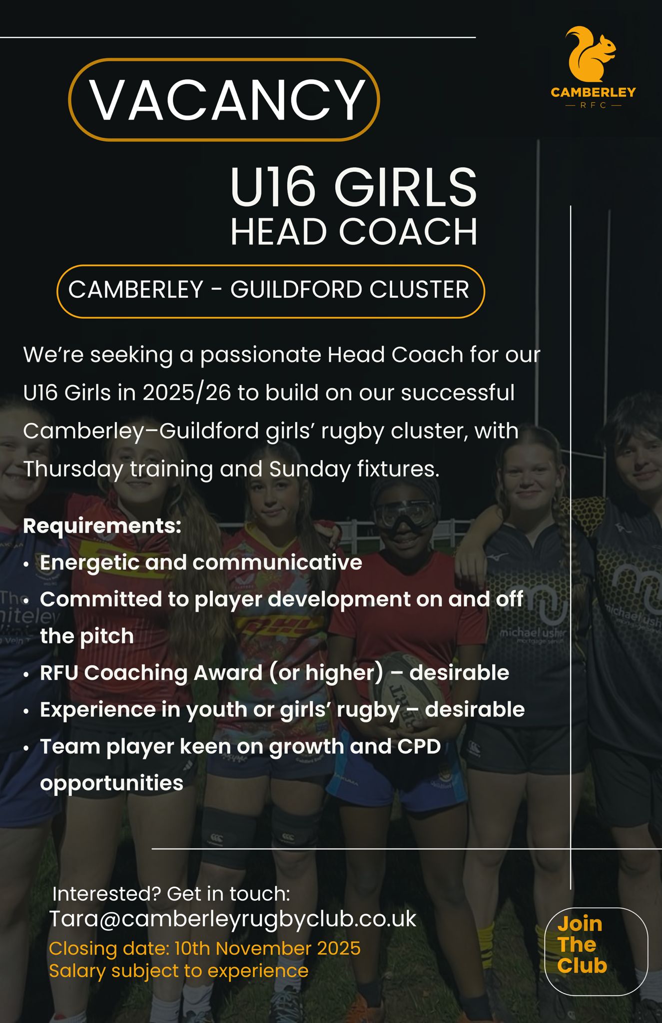 Interested? Get in touch with Tara@camberleyrugbyclub.co.uk to find out more or to apply.